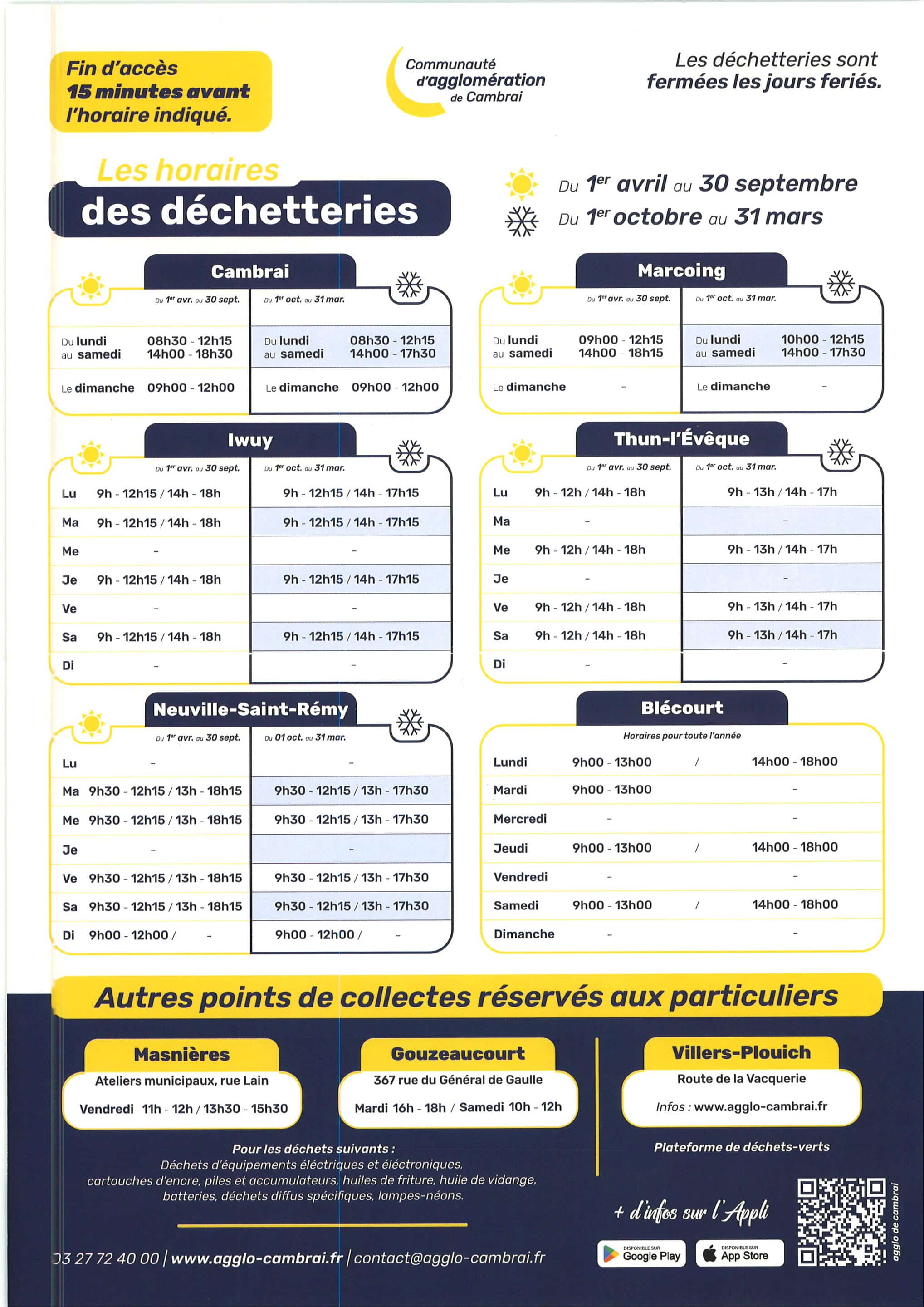 Les habitants de la CAC ont accès aux 6 déchetteries situées sur son territoire : à Marcoing, Neuville St Rémy, Cambrai, Iwuy, Blécourt et Thun St Martin.