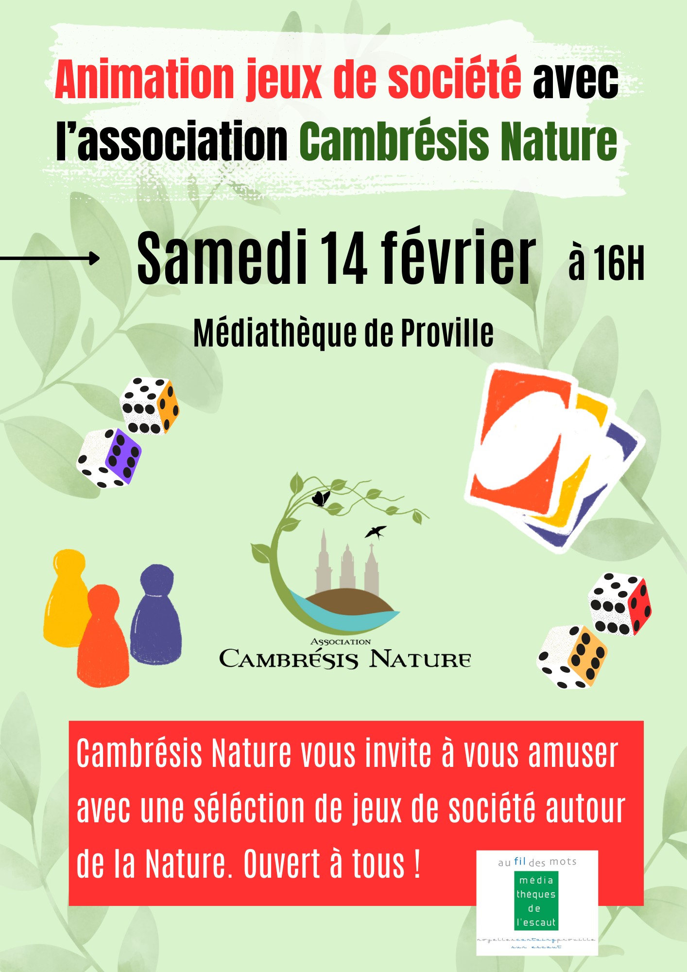 Samedi 14 février, à partir de 16h, l’association Cambrésis Nature vous invite à vous amuser en famille à la médiathèque avec une sélection de jeux de société autour de la nature.