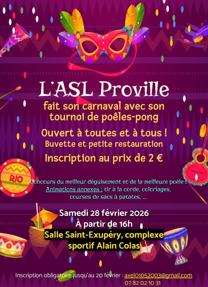 L’ASL Proville fait son carnaval avec un tournoi de POÊLES-PONG, samedi 28 février à salle St-Exupéry, à partir de 16h !