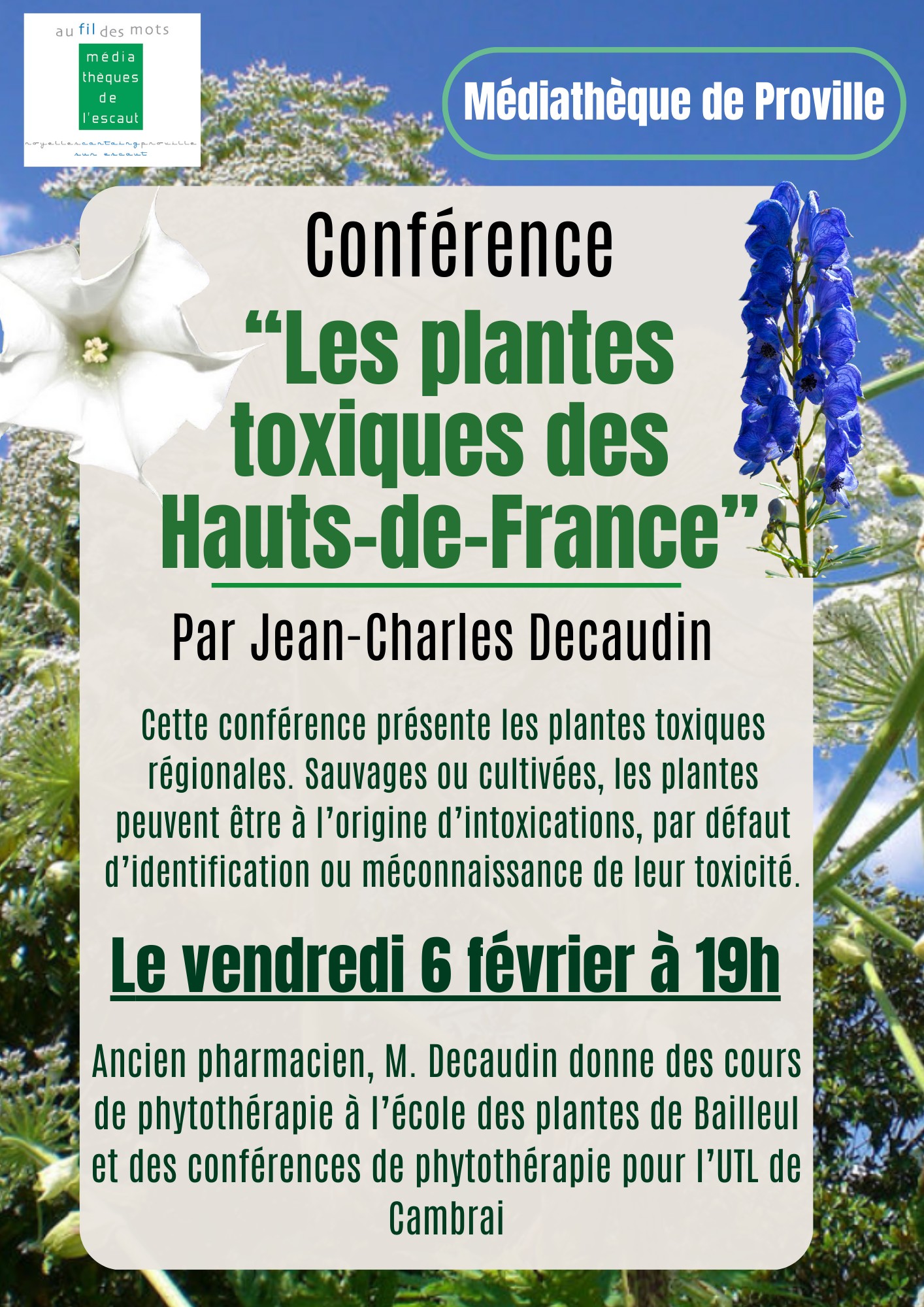 Dans le cadre du « Février des Sciences 2026 », qui a pour thème « la botanique », la médiathèque reçoit Jean-Charles Decaudin, ancien pharmacien cambrésien, pour une conférence sur « Les plantes toxiques des Hauts-de-France », vendredi 6 février à 19h.