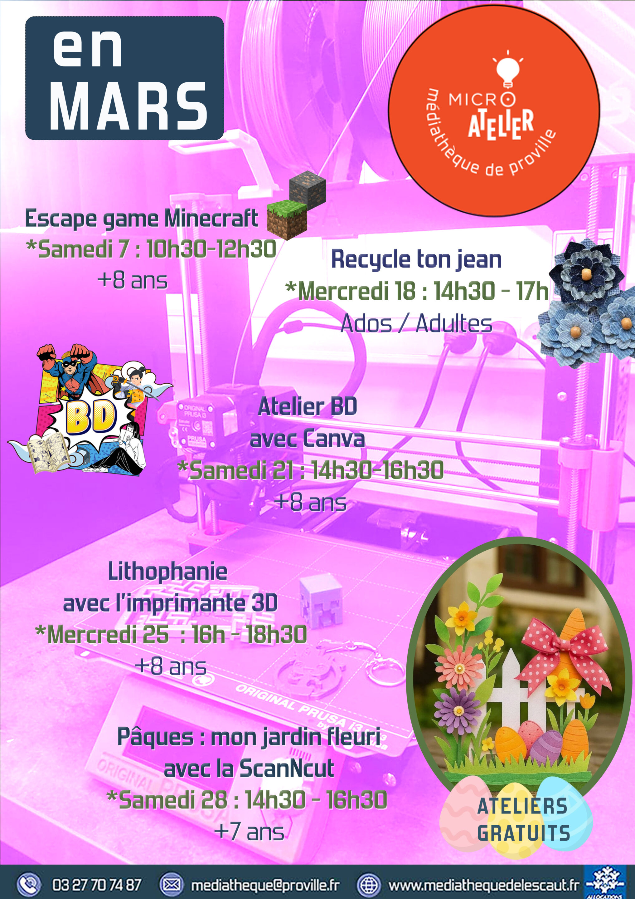 Pour réserver, appelez la médiathèque au 03 27 70 74 87 ou envoyez un mail à mediatheque@proville.fr